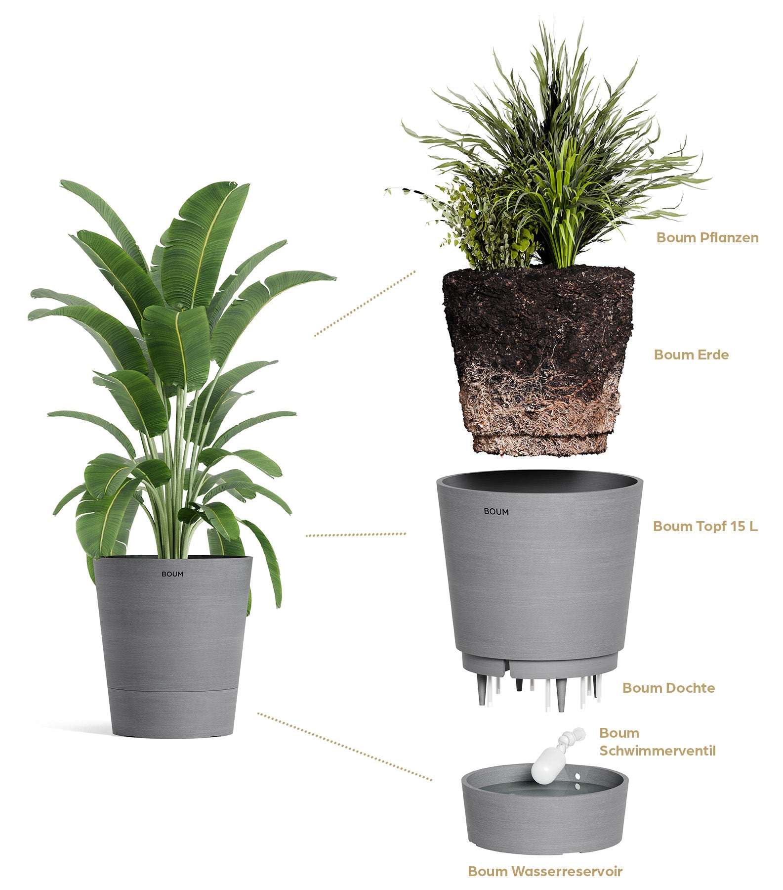 The Boum soils (sold separately for indoor and outdoor) have been specially optimized for the Boum irrigation system. They offer a good capillary effect and thus draw the water from the wicks upwards. In the outdoor soil, a layer of reed mulch reduces water loss and prevents silting. When it rains, the pot becomes a rain catcher: the water flows from the soil into the lower part of the pot and is stored there. Standing water in the root area is thus avoided. In the indoor soil, a high mineral content ensures optimal soil moisture and prevents fungus gnat infestation.