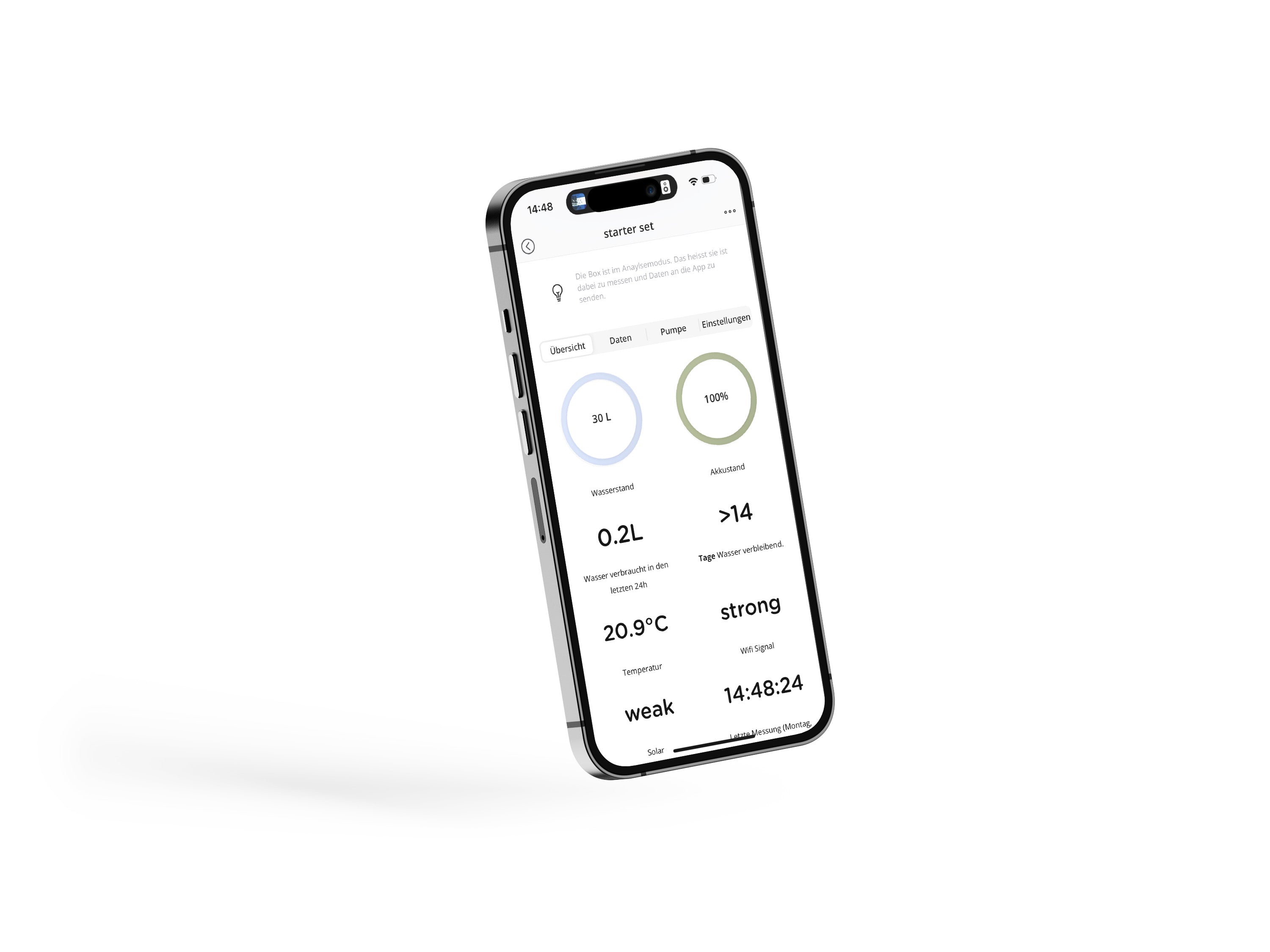 The Boum controller is located on top of the tank. It measures water consumption and water level and controls the pump that supplies the pots with the right amount of water once a day. Thanks to a small solar panel, no special connections are required. Inside, you can conveniently power the tank via USB-C.