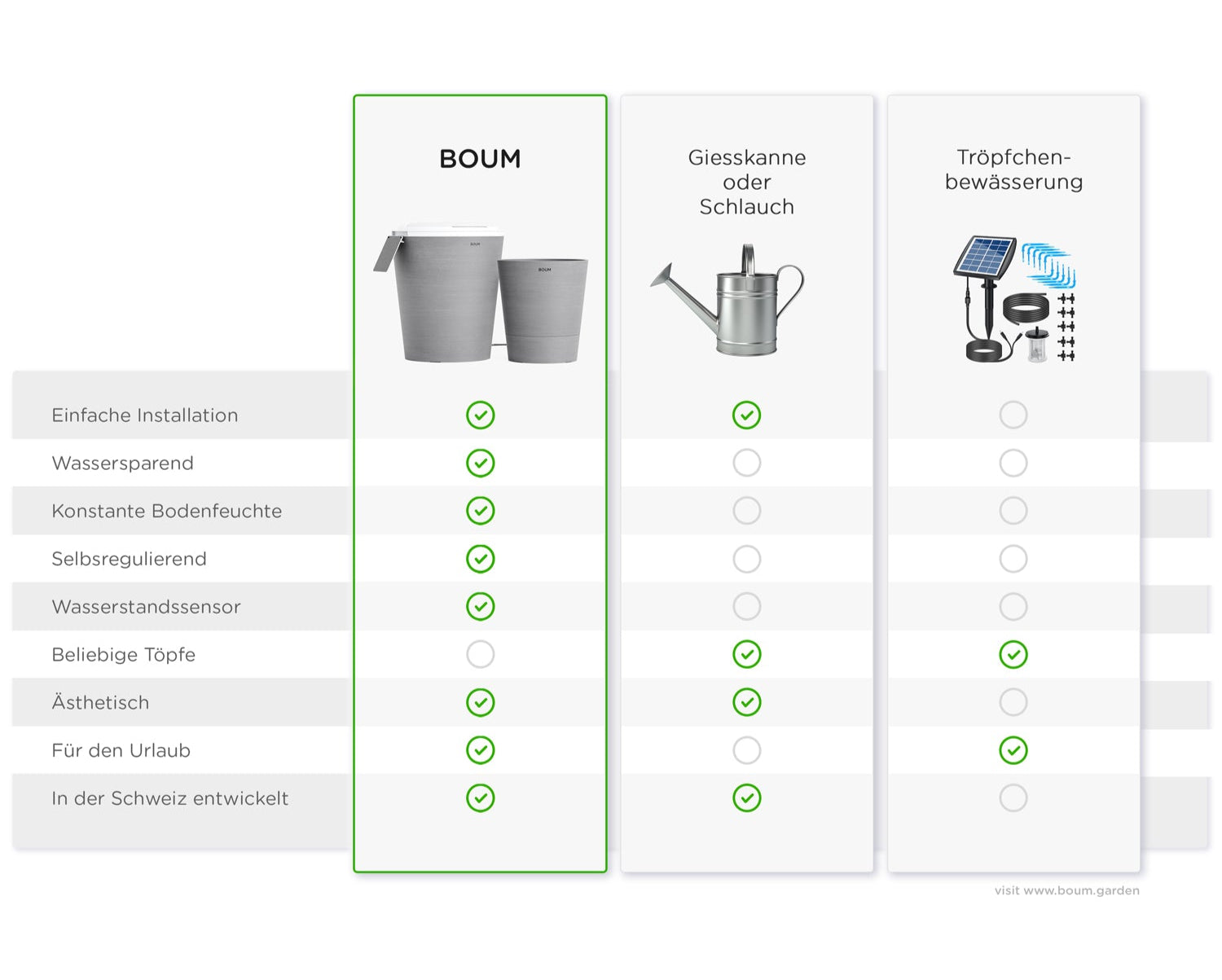 Why is the Boum system better than conventional drip irrigation? It's very simple. The control system measures the water level in the water tank and pumps water into our containers. From there, the water is drawn up into the soil using wicks. The soil moisture regulates itself depending on the plant's water requirements and creates an optimal moisture gradient for good rooting. Completely self-regulating. Even without electricity or a water connection.