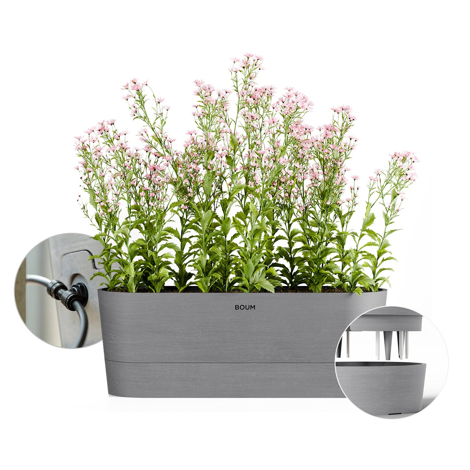 With the Boum planters you can grow trees, vegetables, herbs, flowers and shrubs - with beautiful results that surpass anything you can achieve with conventional pots! The pots are connected to the water tank via an unobtrusive, easy-to-install hose and are thus supplied with water completely autonomously for several weeks. The Boum pots are made of 80% recycled mineral-plastic mixture with a hand finish, they are decorative, shock and break-proof, easy to move and UV and frost resistant