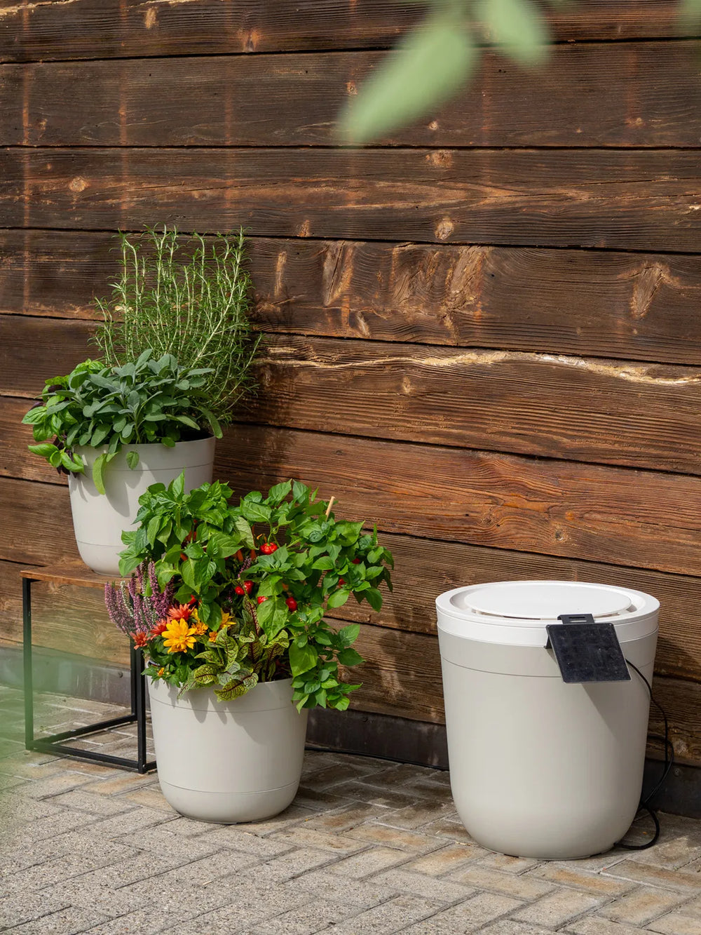 Der Tank fasst 32 Liter Wasser. Die wahre Magie aber liegt in der solarbetriebenen Steuerung. Sie dient als Tankdeckel und ist das Hirn des Systems. Sie füllt die Reservoire der angeschlossenen Töpfe mit einer integrierten Pumpe einmal täglich auf, so dass die Pflanzen jederzeit Wasser zur Verfügung haben. Im Aussenbereich reicht eine Tankfüllung so für mehrere Wochen, im Innenbereich sogar für mehrere Monate! So musst du dir keine Sorgen um deine Pflanzen machen, während du im Urlaub oder im Alltag bist - Boum kümmert sich um sie.