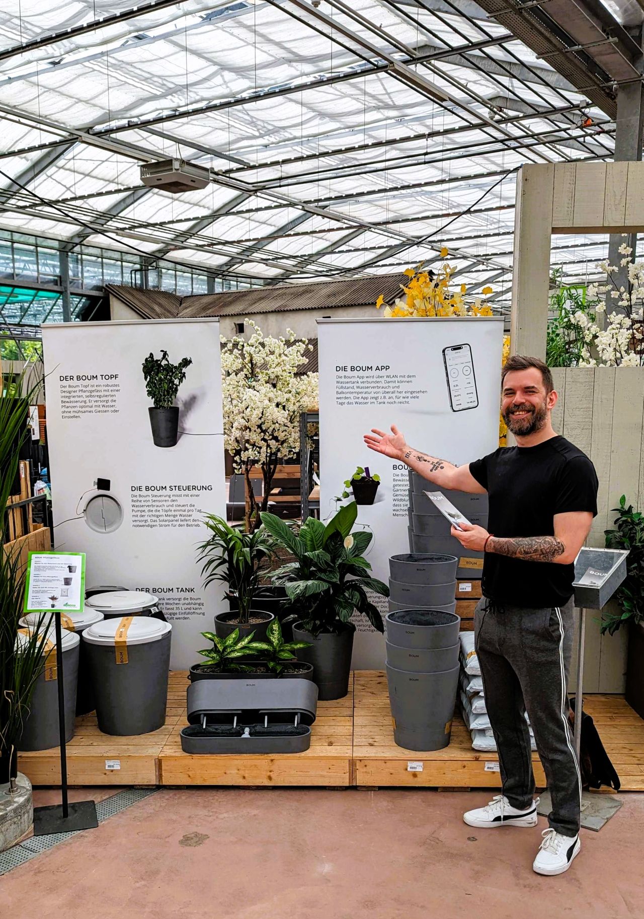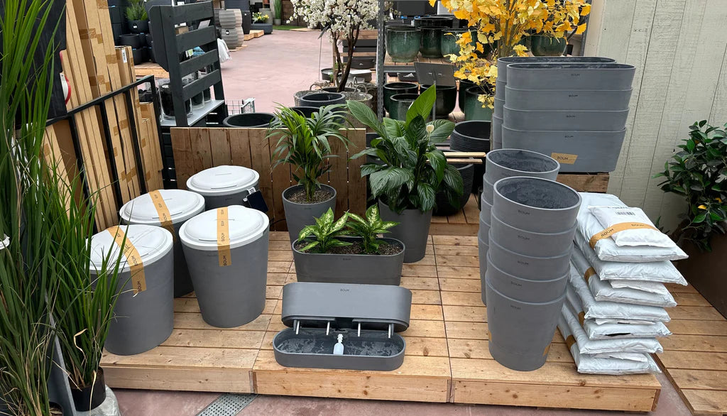 Boum 2 und Boum 3 Systeme und Pflanzgefässe, Zubehör und Erde. Pflanzen in der Ausstellung.